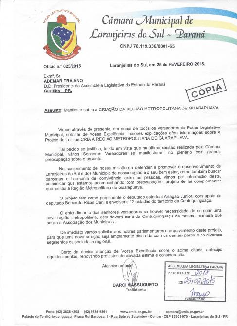 Câmara se manifesta contraria a criação da Região Metropolitana de Guarapuava.