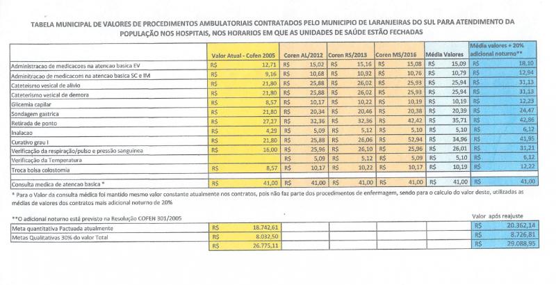 Conforme a Secretaria de Saúde, os procedimentos de enfermagem estão baseados, atualmente, na Resolução n° 301 de 2005 do COFEN (Conselho Federal de Enfermagem), que prevê o reajuste por meio dos Conselhos Regionais da área. Em contrapartida, a correção não aconteceu no Estado do Paraná, sendo a secretaria municipal orientada pelo Departamento Jurídico a instituir uma tabela no âmbito local.