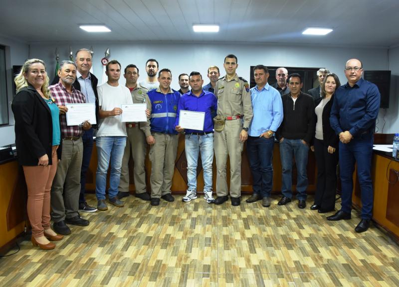 Homenageados - Entre os homenageados estão os soldados Dêniel Régis Batista, Michel de Oliveira e Valdir Fabiane; da Secretaria de Viação os servidores Leandro Nitz, Fabio de Barros, Agostinho Maia, Jeferson Paulo Maia e Antonio Tomé de Freitas Filho, o “Tio Tomé”. Da Secretaria de Obras e Urbanismo recebeu a honraria o servidor Willian Pavlak.