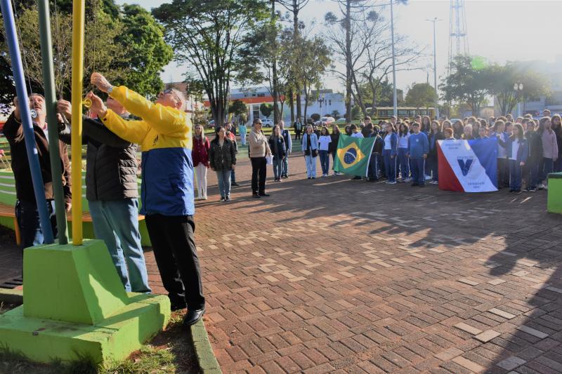 A Câmara Municipal de Laranjeiras do Sul, representada pelo 2° Secretário, vereador Ivaldonir Panatto, participou na manhã desta quinta-feira (1°), na Praça José Nogueira do Amaral, da cerimônia de hasteamento das bandeiras e execução dos hinos, marcando o início da Semana da Pátria. O evento é tradicionalmente realizado com a participação das escolas municipais e marcou a abertura oficial das comemorações pela data.