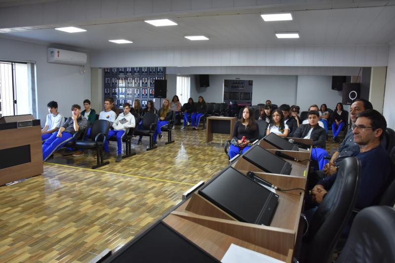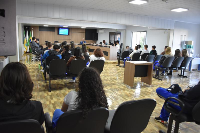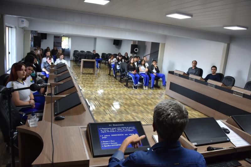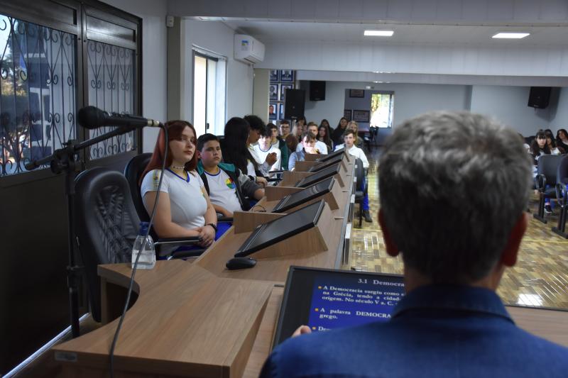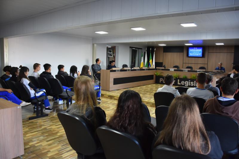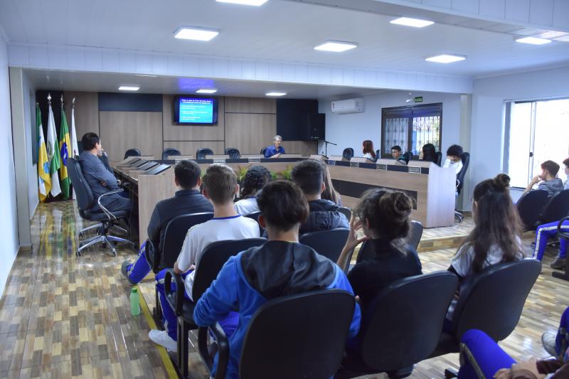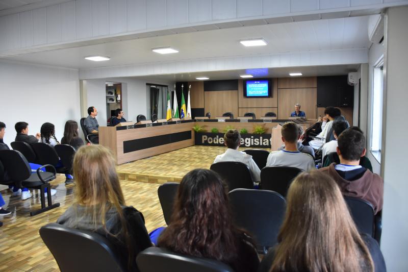 Na tarde de quarta-feira (05) os alunos do colégio Floriano Peixoto, de Laranjeiras do Sul, visitaram a Câmara municipal. Na oportunidade, o consultor legislativo da Câmara Gilmar Zocche, realizou uma palestra falando sobre os três poderes, como funciona a câmara municipal e como são realizadas as ações dos vereadores.