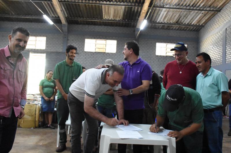 A prefeitura de Laranjeiras do Sul assinou hoje um termo de fomento com a Associação dos Catadores de Recicláveis Dois Irmãos. Serão repassados R$ 3 mil reais mensalmente à associação. Além disso, também foram entregues sextas básicas aos trabalhadores do local.