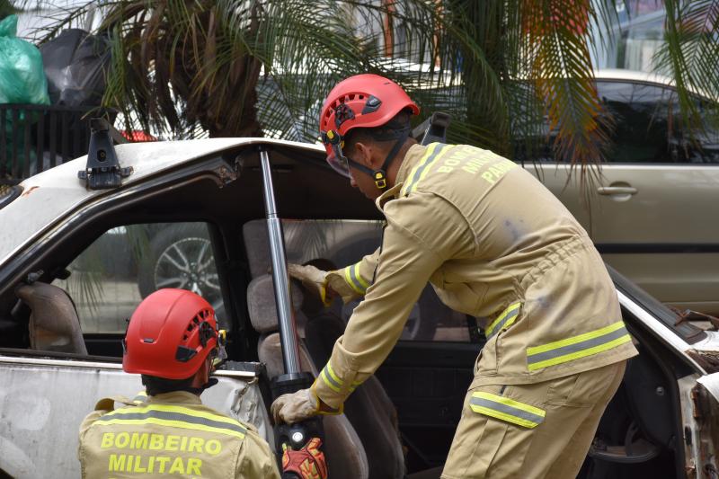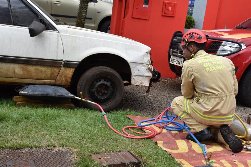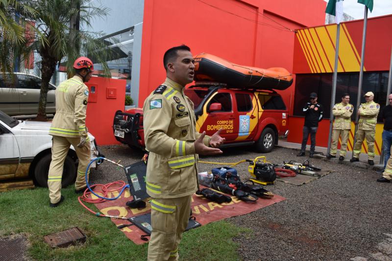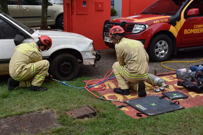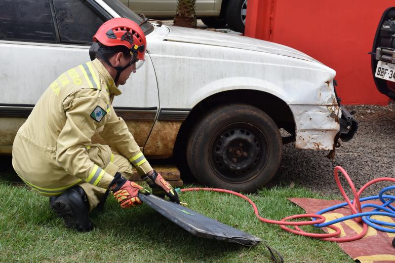 Também na demonstração, um carro foi erguido em poucos segundos com as almofadas pneumáticas que também dão agilidade ao resgate de vítimas que por acidente possam ficar debaixo de veículos.
