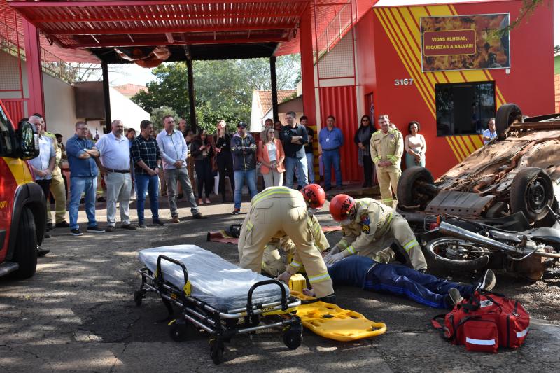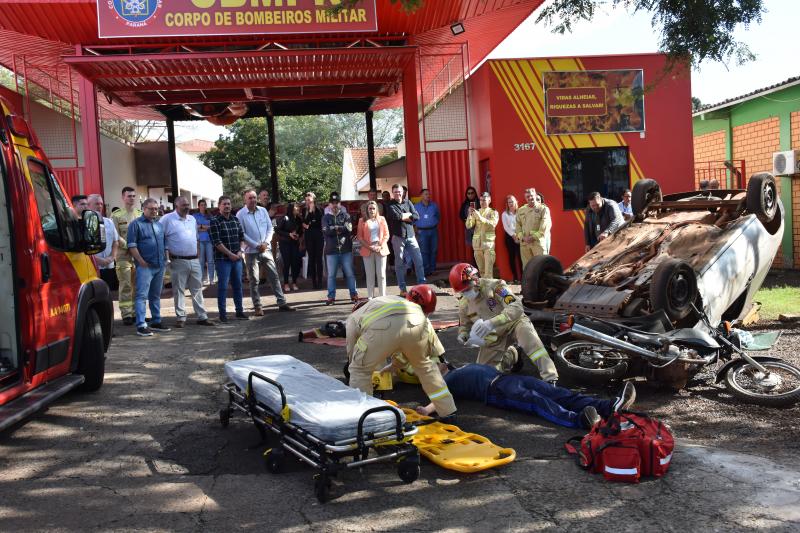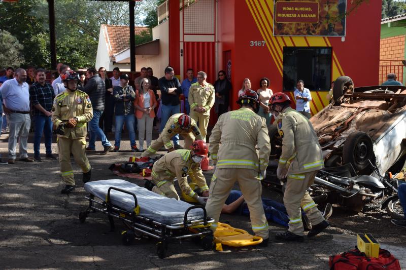 Os bombeiros também realizaram na manhã de hoje, junto á solenidade, uma simulação de atendimento a acidente de trânsito. Na simulação, puderam mostrar como são utilizados os novos equipamentos dos bombeiros.