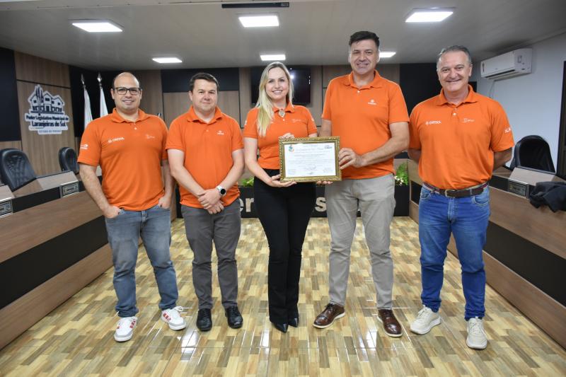 A Câmara de Vereadores de Laranjeiras do Sul entregou uma Moção de Aplausos e Reconhecimento à Cresol Vale das Águas PR/MG, em comemoração aos 30 anos de atuação da cooperativa no município. A homenagem, proposta pelos vereadores Juvinha Viola e Tarso Campigotto, ressalta a importância da Cresol na construção do desenvolvimento econômico e social de Laranjeiras do Sul e de toda a região.