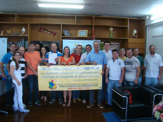 Em ato realizado na tarde desta segunda-feira (28), a prefeita Sirlene Svartz recebeu um cheque simbólico no valor de R$ 488.400,00 referente a devolução de recursos do Poder Legislativo relativo ao ano de 2015 período em que o presidente da Casa de leis é o vereador Darci Massqueto. O recurso livre que já foi depositado na conta da prefeitura será utilizado em 2016, prioritariamente na área de mobilidade urbana, estiveram presentes no entrega o Presidente Darci Massuqueto,Vice-Presidente Carlos Alberto Machado(Magrão),2ºSecretário Elton Ruths e os vereadores Aldemar Becker, Ivone Portela e Laureci Leal, funcionários do legislativo e Secretários Municipais.