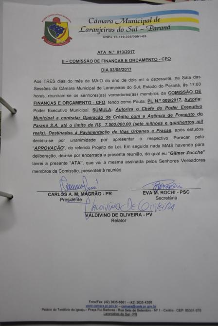 As Comissões de Finanças e Orçamento e Constituição e Justiça discutiram acerca do projeto de lei de autoria do Poder Executivo que autoriza o prefeito municipal a contratar Operação de Crédito com a Agência de Fomento do Paraná S.A. até o limite de R$ 7.5 milhão destinados à Pavimentação de Vias Urbanas e Praças. Após estudos decidiu-se por unanimidade pela Aprovação do mesmo, em ambas as Comissões.