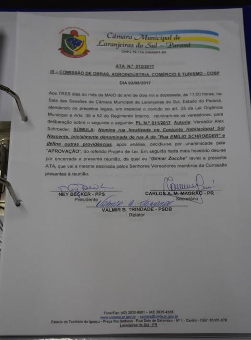 Além disso, a Comissão de Obras, Agroindústria, Comércio e Turismo, constituída pelos vereadores Carlos Machado Magrão, Ney Becker e Valmir Sete discutiram sobre o projeto 011/2017 de autoria do vereador Alex Schroeder que decide nominar a rua localizada no Conjunto Habitacional Sol Nascente, inicialmente denominada de rua A para "Rua Emílio Schroeder". Após maiores estudos, os membros decidiram pela Aprovação.