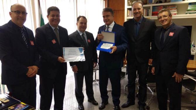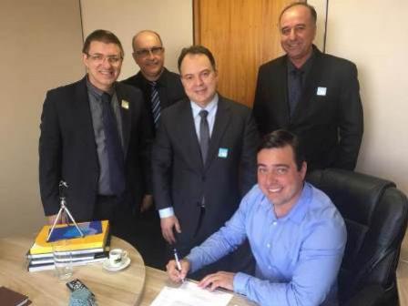 Vice-prefeito Valdemir Scarpari, deputado federal João Arruda, vereador Júnior Gurtat, Ministro do Turismo Marx Beltrão, prefeito Berto Silva e vereador Carlos Alberto Machado