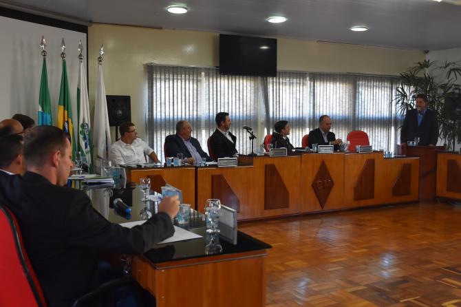A cerimônia teve início pela composição da mesa e canto dos hinos Nacional e Municipal. Na sequência o prefeito Berto Silva levou a mensagem do Executivo à Câmara. O gestor destacou a parceria com o Legislativo, relembrando, por exemplo, a aquisição de ônibus para transporte de universitários, adquiridos com recursos da Prefeitura, da Câmara de Vereadores e da UAD. O prefeito ainda reiterou o empenho do Legislativo na aprovação de importantes projetos como do financiamento junto ao Paraná Urbano para obras de pavimentação asfáltica.